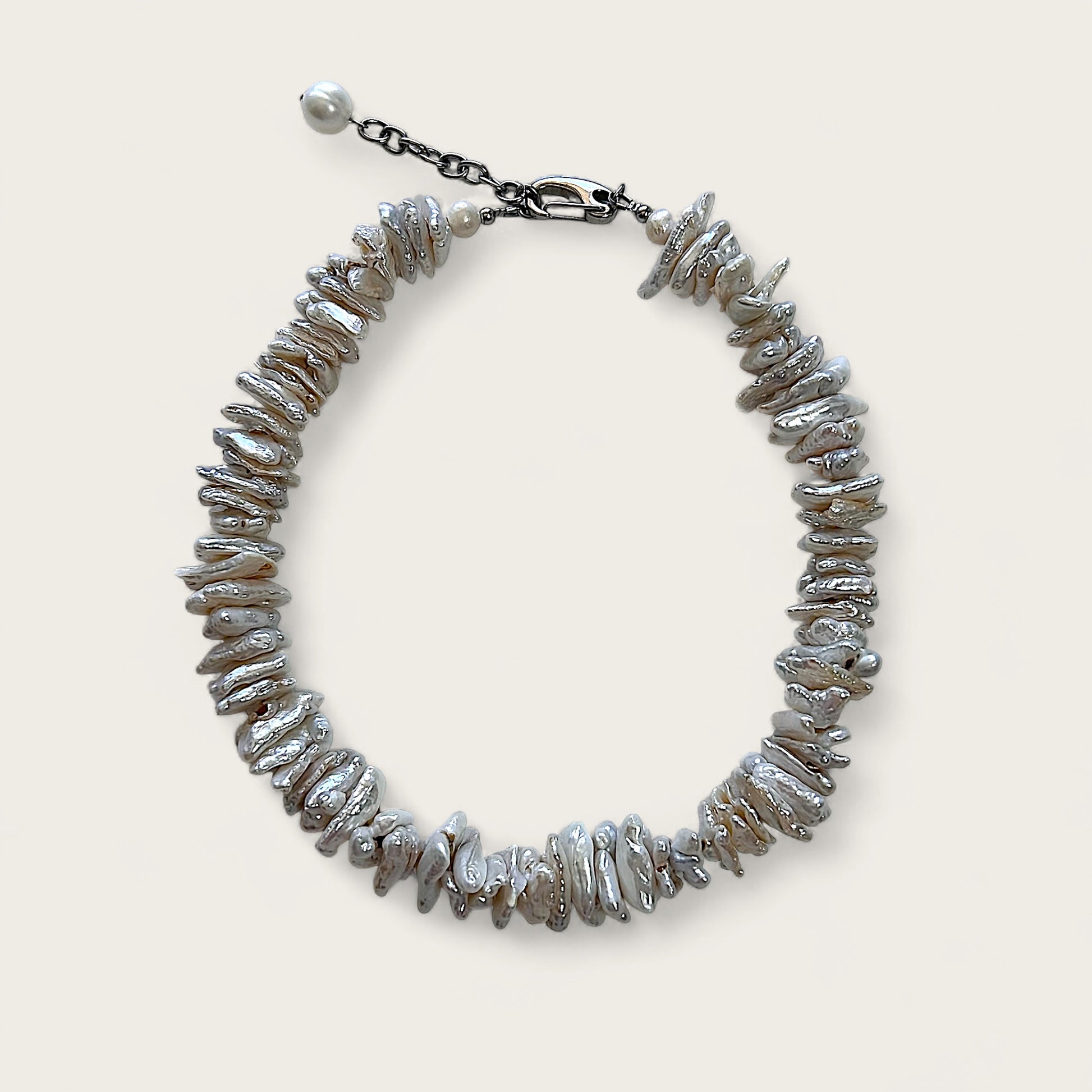 Our Hydra Necklace it’s a handcrafted piece with heishi freshwater pearls from Bali design to be a unisex piece complemented by silver plated clasp and extension chain.